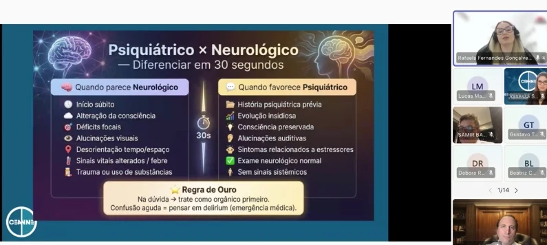 Durante o IX Simpósio de Neurociências do CEANNE, a Dra. Rafaela conduziu uma discussão aprofundada sobre emergências psiquiátricas, abordando critérios clínicos fundamentais para a diferenciação entre quadros psiquiátricos e neurológicos no atendimento de urgência.